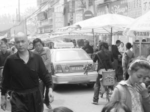 記者在育新街與六一路交叉口看到,路口的許多商販都把商品直接擺放在行車道上,有人站在街上與小販討價(jià)還價(jià),自行車、電動(dòng)車就橫七豎八地停在馬路上。站在路口往南看,高懸的禁行標(biāo)志下,剛好停了一輛綠色的出租車,本來就不寬的馬路被占去一半。