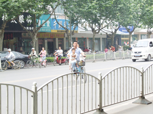 看這位父親,單手騎車橫穿馬路,另一只手還抱著孩子。(攝影:菩薩保佑)