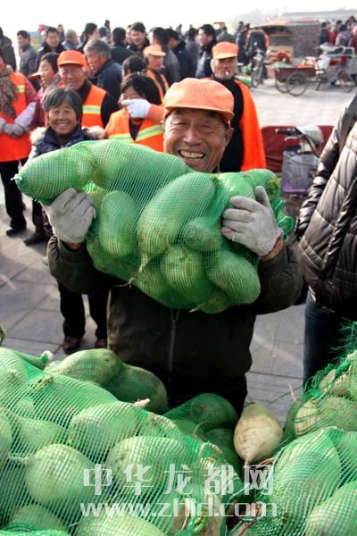當天上午,淮陽縣太昊陵廣場人頭攢動,1000余名貧困家庭代表早早地來到現(xiàn)場等候。9時許,“愛心蘿卜”開始免費發(fā)放。僅一上午時間,20萬斤蘿卜就被認領一空。