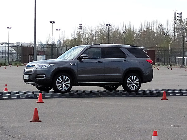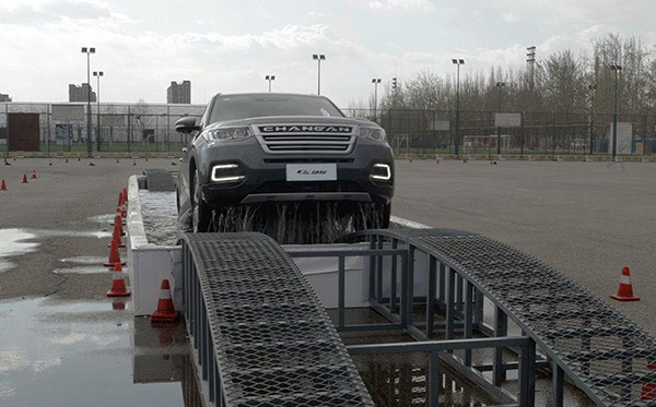 第三個項目是緊急避讓,體驗車輛抓地性;接下來的側(cè)面斜坡項目長安CS95順利通過,車身并未有異響。