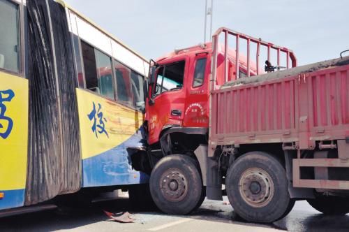 ????????記者觀察到,大客車側(cè)面寫有“交通駕?!币恍写笞郑囶^朝西車尾朝東停著,右側(cè)車身被橋墩緊緊卡??;運(yùn)水罐車長(zhǎng)近20米,車身與大客車車身幾乎呈90度直角,運(yùn)水罐車車頭撞在大客車的左后側(cè),將大客車撞癟了。事發(fā)地點(diǎn)位于橋坡處,地面遍布七零八落的玻璃碎片,運(yùn)水罐車下面還有少量血跡。運(yùn)水罐車和大客車內(nèi)均空無(wú)一人。