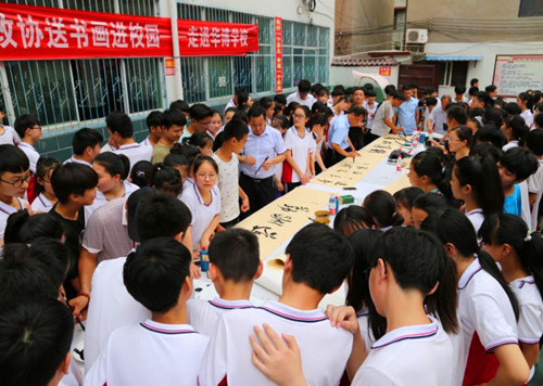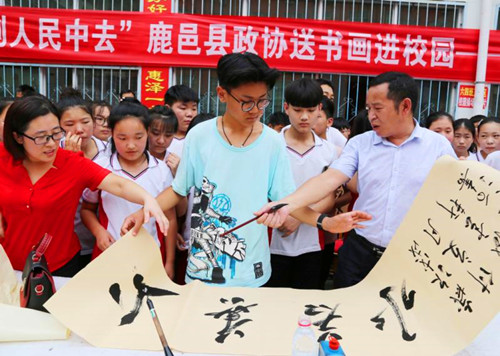 中華龍都網(wǎng)訊(周口報(bào)業(yè)全媒體記者 李瑞才 通訊員 孫廣合 胡洪濤)6月26日上午,鹿邑縣政協(xié)和縣文聯(lián)聯(lián)合開展“到人民中去”送書畫進(jìn)校園活動(dòng),組織10余位知名書畫家走進(jìn)校園,現(xiàn)場揮毫潑墨,為師生義寫字畫。