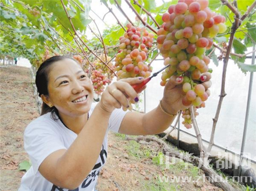 7月4日,商水縣鄧城鎮(zhèn)返鄉(xiāng)農(nóng)民工馮杰在采摘葡萄。馮杰和丈夫葉天力在鎮(zhèn)人大和扶貧辦的幫助下,投資300多萬(wàn)元?jiǎng)?chuàng)建110畝天力葡萄采摘園,取得了較好的收益。 喬連軍 攝