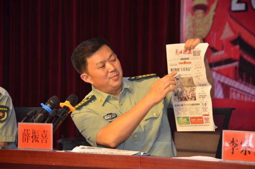 在當天的動員會上,薛振喜副司令員手持《周口晚報》說,報紙上刊登的“周口好兵”系列報道,每一篇都是一個榜樣,每一篇都是一種激勵,希望在座的預征青年們到部隊后咬牙堅持、刻苦錘煉,打響周口好兵品牌,家鄉(xiāng)父老等著你們早立新功的喜訊。