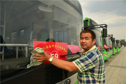 隨著省第十三屆運(yùn)動(dòng)會(huì)開幕式臨近,近日,市公交總公司接送演職人員的公交車已經(jīng)增至近百輛,這些公交車的司機(jī)每天都要工作到午夜2時(shí)許。據(jù)悉,從今年4月份省運(yùn)會(huì)先期比賽項(xiàng)目開賽以來,市公交總公司已為省運(yùn)會(huì)出動(dòng)公交車2800臺(tái)班,中心城區(qū)公交候車亭提升改造工程也正在快速推進(jìn)中。圖為市公交二公司的劉師傅利用閑暇時(shí)間擦車。②5記者 梁照曾 攝