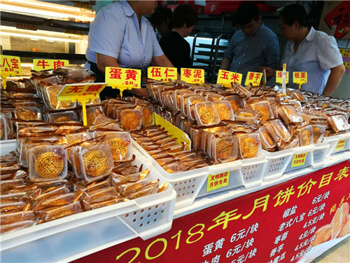 “給我拿兩斤青紅絲酥皮和五仁的。”一位50出頭的女士邊付錢邊說,小時候,過中秋節(jié),一家人圍坐一起吃這種半斤重的老式月餅,一個月餅分八塊,一人一塊,現(xiàn)在回想起來,“真甜”!