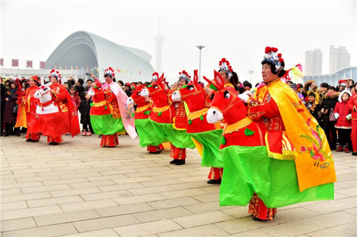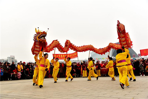展演現(xiàn)場(chǎng),人頭攢動(dòng),鑼鼓喧囂,16名身穿金黃、亮藍(lán)衣服的舞龍隊(duì)員率先登場(chǎng),金燦燦的巨龍時(shí)而甩尾前行,時(shí)而昂首盤踞,浩浩蕩蕩;8只舞獅歡騰雀躍、活靈活現(xiàn);精美的裝飾的旱船穿行其中,老生、老旦扮相的隊(duì)員邊走邊唱;整齊劃一的腰鼓隊(duì)以及隊(duì)形優(yōu)美的擔(dān)經(jīng)挑把現(xiàn)場(chǎng)氣氛推向高潮……持續(xù)近2小時(shí)的展演活動(dòng)中,精彩的民俗表演令人目不暇接,為這座城市增添了濃濃的年味。