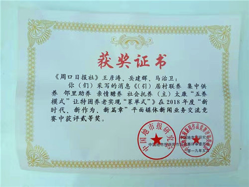 中國地市報新聞獎評選活動由中國地市報研究會主辦,每年舉辦一次,在全國有著廣泛的影響,此項新聞獎評選活動涉及全國幾乎所有地市黨報,不僅是展示地市黨報形象的重要舞臺,也是衡量地市黨報辦報水平的重要標(biāo)志,同時也是以新聞的形式展示各地亮點工作的重要?!短怠拔屦B(yǎng)模式”讓特困養(yǎng)老實現(xiàn)“菜單式”》稿件在此項新聞獎評選中,同樣表現(xiàn)不凡,最終榮獲中國地市報新聞獎二等獎。