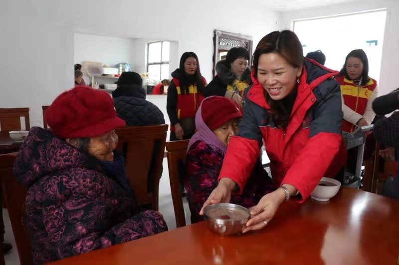 “開飯嘍!”中午時(shí)分,志愿者們將老人一一攙扶到餐廳坐下,隨后將一碗碗香氣四溢、且冒著熱氣的八寶粥端到老人跟前?!跋?,真香!”80歲的黃柏功老人舀了一勺八寶粥放到嘴里品了品笑著說。吃著八寶粥,老人想起了以前的艱苦生活,他禁不住激動(dòng)地哭了起來:“以前,吃了上頓沒下頓,想吃一塊白面饃,都得等到過年??涩F(xiàn)在,天天不斷肉,生活越來越好。這都是共產(chǎn)黨給咱的福啊?!?/p>