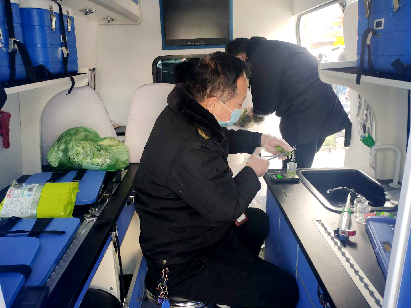 記者看到,食品安全快速檢測(cè)車(chē)與傳統(tǒng)的快檢室相比,更加機(jī)動(dòng)、快速、便捷,可以現(xiàn)場(chǎng)開(kāi)展快速檢測(cè)。車(chē)上配備有農(nóng)藥殘留快速檢測(cè)箱、溫濕度計(jì)、電加熱板、超聲波清洗器等車(chē)載儀器設(shè)備,執(zhí)法人員在實(shí)施剪碎、浸泡、試劑反應(yīng)、數(shù)據(jù)讀取等一系列檢測(cè)步驟后,最快30分鐘就能對(duì)生鮮肉、果蔬、米面油等食品中有毒、有害殘留物質(zhì)等100多項(xiàng)內(nèi)容進(jìn)行快速檢測(cè)。