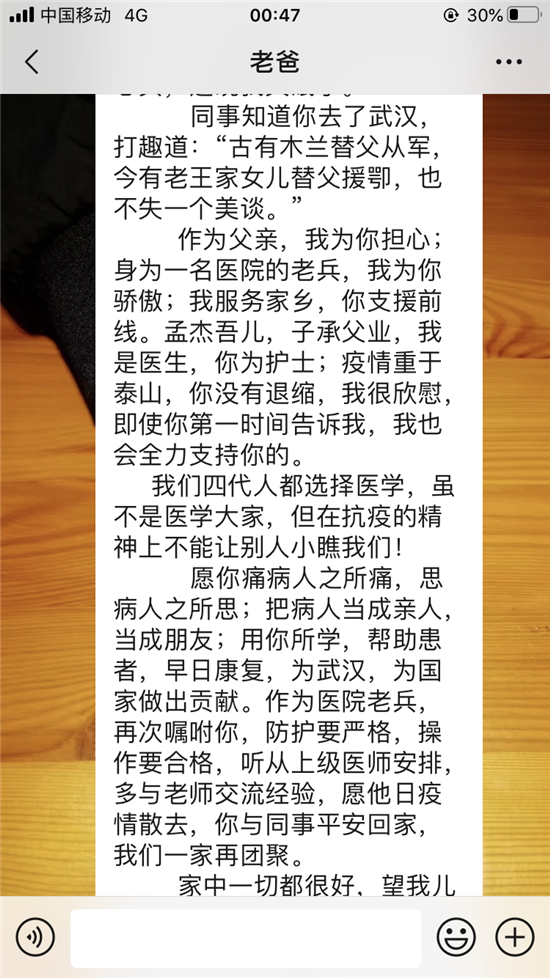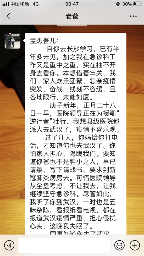 作為父親,我為你擔(dān)心;身為一名醫(yī)院的老兵,我為你驕傲;我服務(wù)家鄉(xiāng),你支援前線。孟杰吾兒,子承父業(yè),我是醫(yī)生,你為護(hù)士;疫情重于泰山,你沒(méi)有退縮,我很欣慰,即使你第一時(shí)間告訴我,我也會(huì)全力支持你的。
