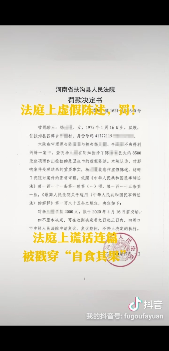 為了將撿到的8500元錢據(jù)為己有,當(dāng)事人竟然在法庭上作出虛假陳述,最終不僅被法官當(dāng)庭識破,全額返還失主,還被法院處以2000元罰款,真可謂得不償失、自食苦果。近日,針對被告楊某的虛假陳述行為,扶溝縣人民法院呂潭法庭依法作出罰款2000元的處罰決定,楊某在規(guī)定時(shí)間內(nèi)繳清了罰款。