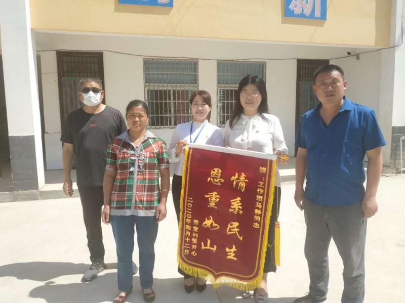5月19日,太康縣王集鄉(xiāng)焦堂行政村張草帽自然村村民萬勤霞來到焦堂村小學(xué),將一面繡有“情系民生 恩重如山”的錦旗送到了該縣紀委常委、監(jiān)委委員馬靜,工作組成員王向花、馬景華、張海亮手中,感動的淚水忍不住地流。