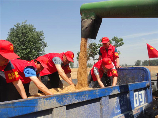 圖為黃寨鎮(zhèn)埠口村幫扶隊(duì)幫助貧困戶麥?zhǔn)铡?/p>