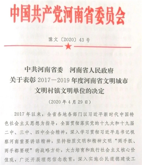 近日,省委、省政府下發(fā)《關(guān)于表彰2017—2019年度河南省文明城市文明村鎮(zhèn)文明單位的決定》(豫文〔2020〕43號),鄲城縣婦幼保健院名列其中,榮獲“河南省文明單位”榮譽稱號。這是我院自1987年首次被授予“河南省文明單位”稱號以來,連續(xù)第33年保持這項榮譽。
