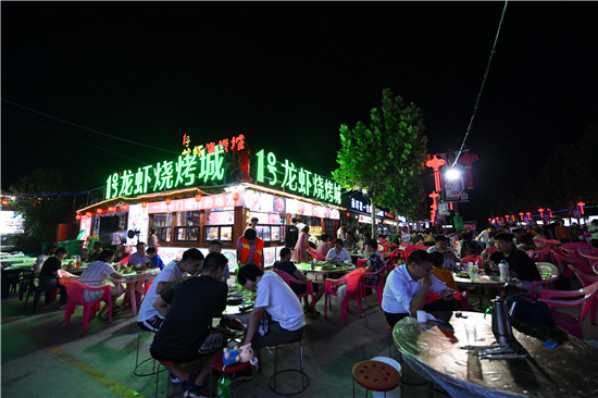 海鮮燒烤、螺螄粉、米線、拉面、刀削面、湯包蛋酒、熱干面、鴨脖子、煎扒魚、干燒鯰魚、油燜大蝦、生煎包、紅燒蝦球、豆腐花……狹窄的街道上,擺滿了簡易的各式圓桌和凳子,琳瑯滿目的各種小吃擺在敞開排列的貨架上,一目了然。顧客隨意選擇自由搭配,各種小吃讓人胃口大開。勞累之余的人們津津有味地吃著小吃,喝著飲料……