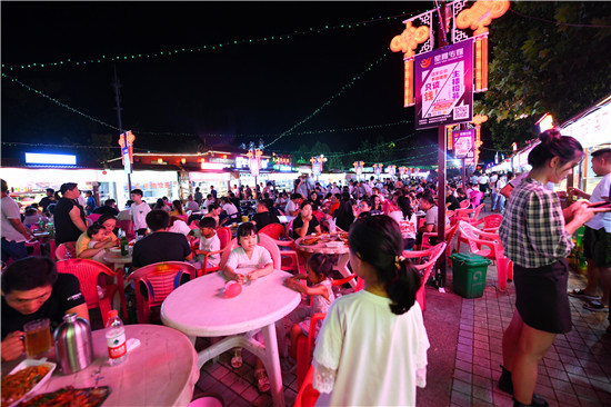 這里云集著全國各地的風(fēng)味小吃,成為廣大市民休閑消暑的打卡地、網(wǎng)紅地,也成了附近居民創(chuàng)業(yè)、就業(yè)的基地。尤其是為推進“創(chuàng)衛(wèi)”工作,開發(fā)區(qū)對這個夜市進行高標準持續(xù)打造,努力提升廣場夜市的經(jīng)營條件和周邊環(huán)境,對各攤點的硬件設(shè)施規(guī)范提升。根據(jù)有關(guān)標準和管理需求,開發(fā)區(qū)協(xié)調(diào)有關(guān)部門,為夜市配備了治安民警、社區(qū)網(wǎng)格員、城管隊員、市場監(jiān)督員、衛(wèi)生監(jiān)督員、市場保潔員。城管部門根據(jù)實際情況,為南廣場規(guī)范停車場地,凈化外部環(huán)境,同時嚴格禁止超越夜市場所范圍經(jīng)營,不斷提升周邊環(huán)境。區(qū)市場監(jiān)督管理分局根據(jù)實際情況,對各家餐飲經(jīng)營攤點的員工進行統(tǒng)一培訓(xùn),協(xié)助辦理餐飲經(jīng)營許可證,同時要求所有工作人員持健康證上崗。根據(jù)餐飲業(yè)經(jīng)營規(guī)范的要求,區(qū)市場監(jiān)督管理分局對各攤點的內(nèi)部設(shè)施進行逐家驗收,嚴格把關(guān),協(xié)助規(guī)范整改,從而形成了良好的餐飲衛(wèi)生環(huán)境。新冠肺炎疫情防控進入常態(tài)化階段以后,開發(fā)區(qū)敏銳地抓住契機,迅速推進復(fù)產(chǎn)復(fù)工,在做好疫情防控規(guī)范的同時,積極推進南廣場夜市恢復(fù)營業(yè)。3月17日,南廣場夜市恢復(fù)營業(yè)后,迅速形成火爆場景。