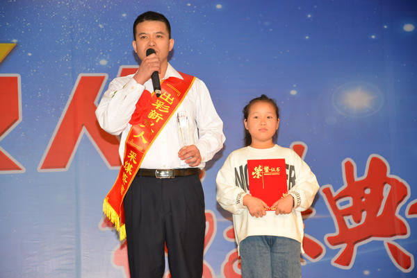 “節(jié)約能手”掘進(jìn)一隊(duì)職工師振東在頒獎(jiǎng)臺(tái)上接過12歲女兒頒發(fā)的獎(jiǎng)杯后,還得到了“小棉襖”的熱情擁抱。