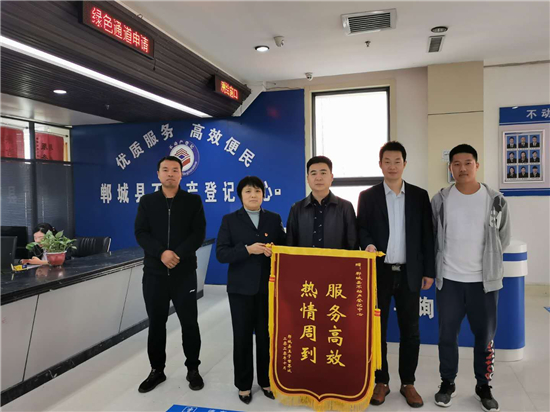 10月20日,鄲城縣王子世界城房地產(chǎn)開發(fā)企業(yè)代表將一面繡有“服務(wù)高效、熱情周到”的錦旗,送到鄲城不動(dòng)產(chǎn)登記中心窗口,對(duì)鄲城縣不動(dòng)產(chǎn)登記中心干部職工,主動(dòng)作為、心系企業(yè)、熱情服務(wù)的工作態(tài)度表示感謝。