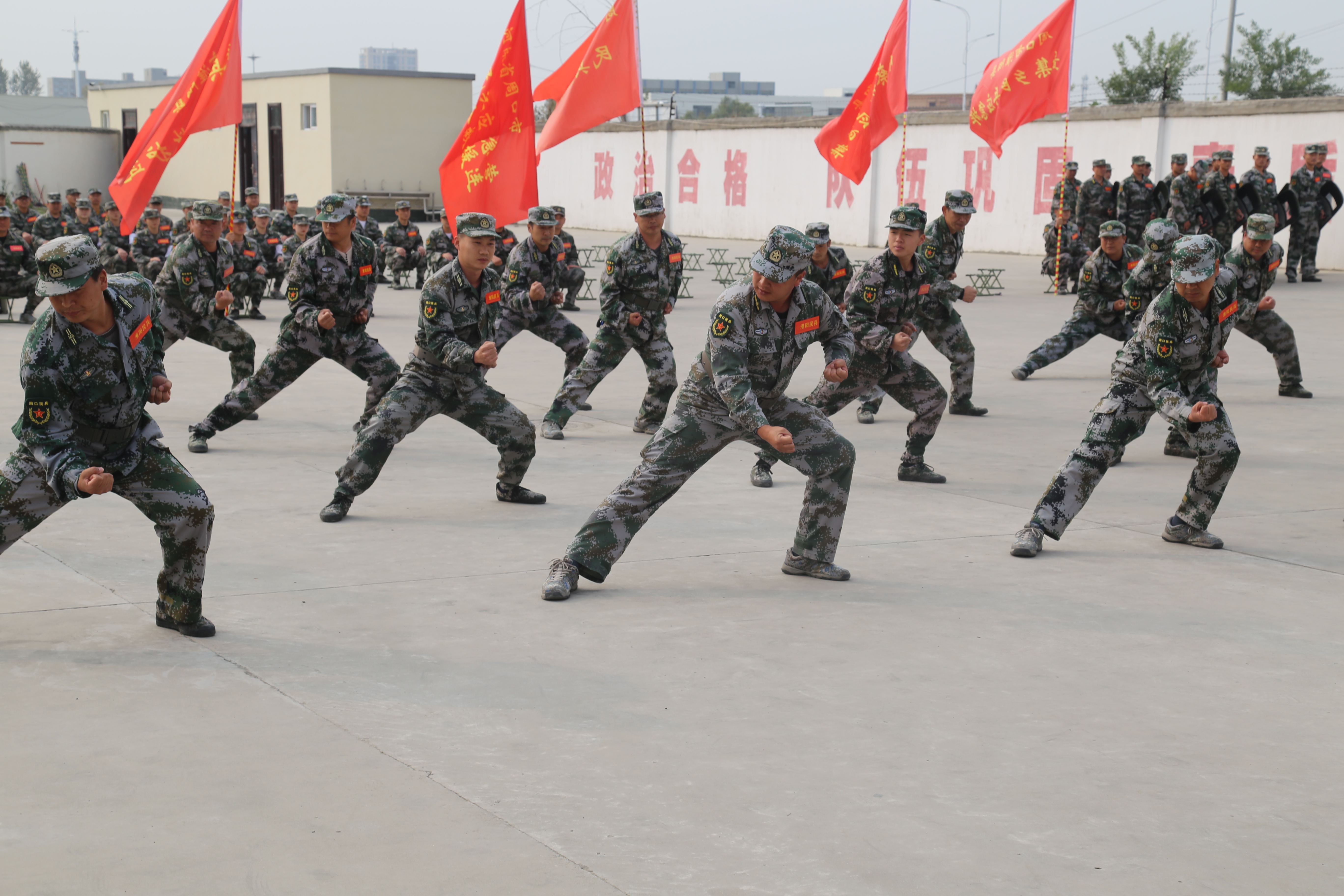 成果匯報(bào)現(xiàn)場,殺聲震天,紅旗招展。軍體拳、警棍盾牌操、戰(zhàn)場救護(hù)、摔擒訓(xùn)練、單個軍人隊(duì)列動作、防爆隊(duì)形、隊(duì)形運(yùn)動等訓(xùn)練項(xiàng)目一一上演,每位民兵的一舉一動、一招一式,都展現(xiàn)了基干民兵“聽黨指揮、能打勝仗、作風(fēng)優(yōu)良”的強(qiáng)軍目標(biāo),展現(xiàn)了大家召之即來、來之能戰(zhàn)、戰(zhàn)之必勝的優(yōu)良作風(fēng),受到了軍地領(lǐng)導(dǎo)的一致好評。