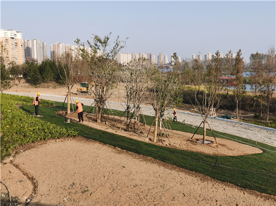 11月11日,在中心城區(qū)沙潁河北岸周口大道至八一大道段生態(tài)改造工程EPC項(xiàng)目施工現(xiàn)場,施工人員正在進(jìn)行地被植物的種植、綠化樹木的養(yǎng)護(hù)。