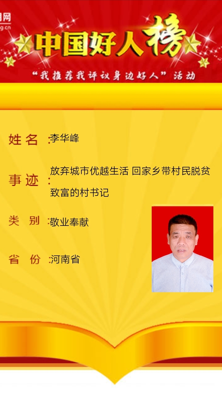 昨日,記者從市文明辦獲悉,今年46歲現(xiàn)任太康縣轉(zhuǎn)樓鎮(zhèn)李報(bào)真行政村黨支部書記的李華峰,放棄城市優(yōu)越生活,回鄉(xiāng)帶領(lǐng)村民致富,榮登2020年10月份“敬業(yè)奉獻(xiàn)”類“中國好人榜”。至此太康縣中國好人達(dá)到67人。