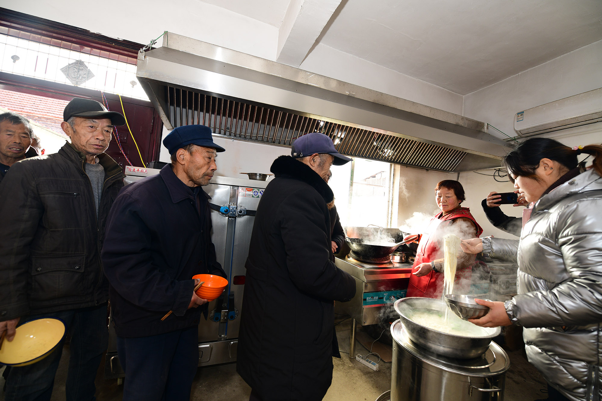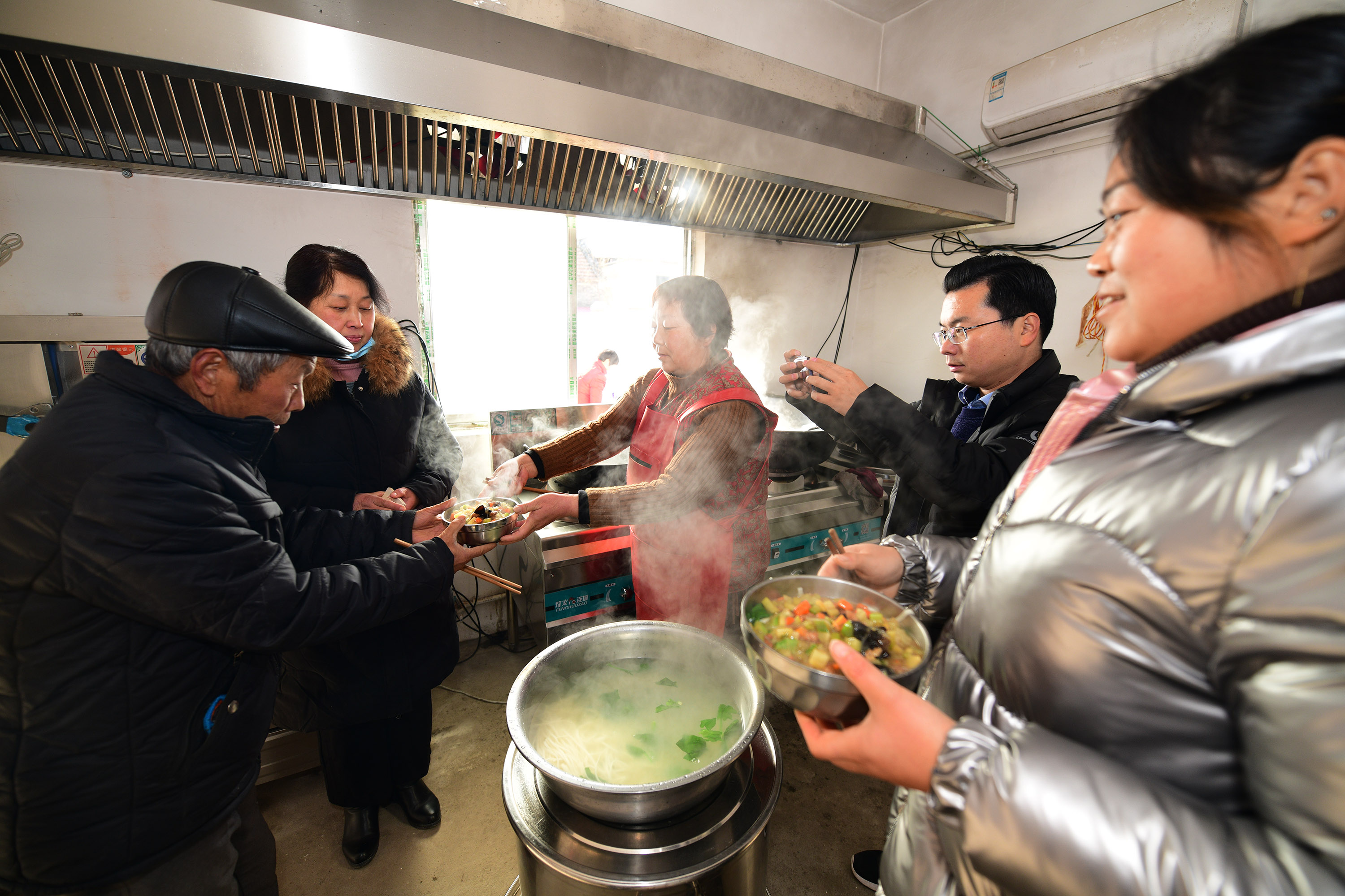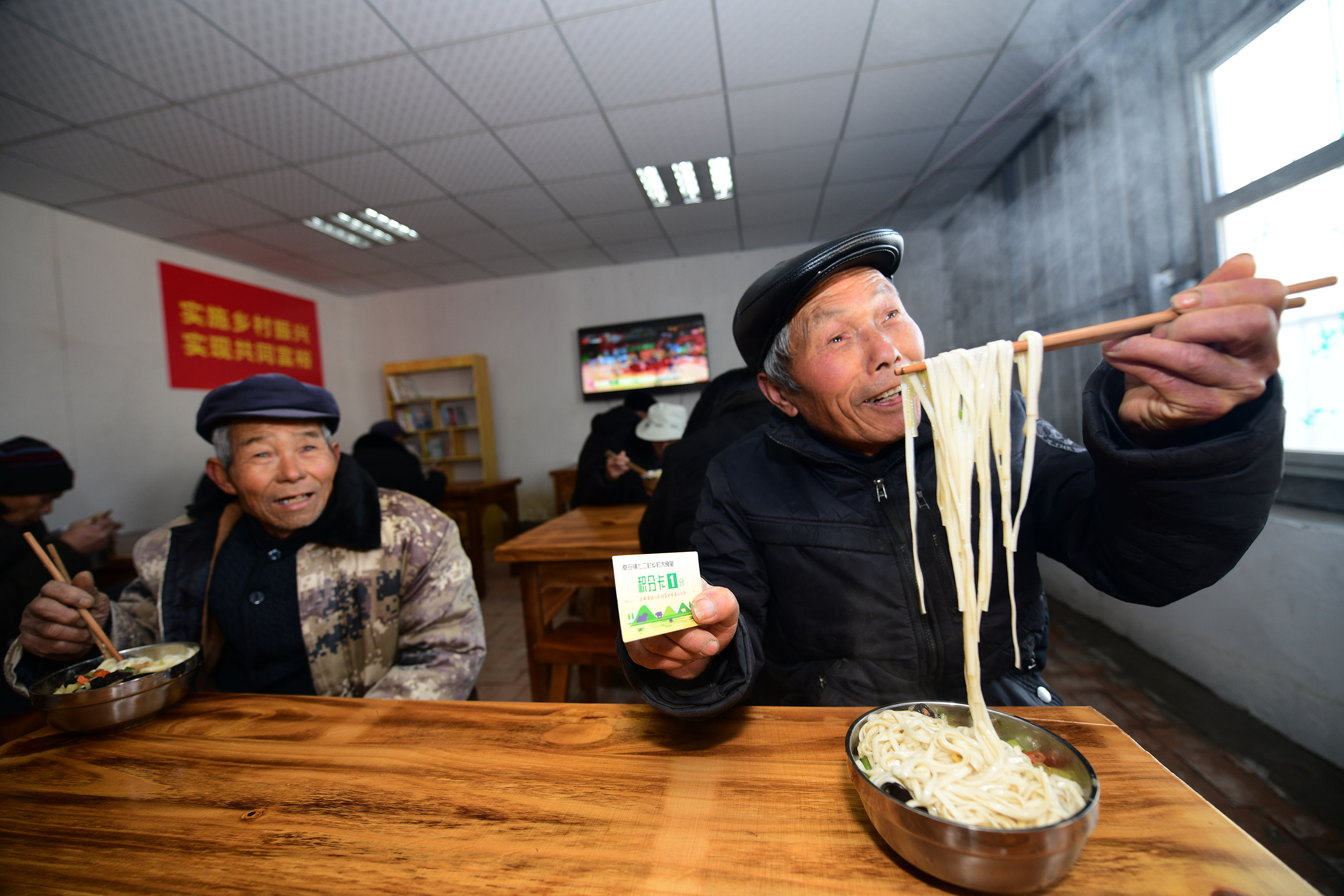 兩個(gè)月前,經(jīng)過籌備,七里倉二村的村食堂建成,大鍋飯開伙。食堂設(shè)在一家去世的五保戶家里。村里將房子內(nèi)外粉刷一遍,還買來了廚具、桌椅。做大鍋飯的是村里的兩名留守婦女。記者于12月15日中午趕來時(shí),村食堂正開飯,老人們憑票打飯,午飯是臊子面。老人每人端一碗,來到飯廳就餐。這里有村里裝的電視,大家邊聊天邊吃飯邊看電視,其樂融融。