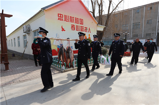隨著春節(jié)日益臨近,該派出所所長楊杰和大家商議,“送溫暖送祝福”活動,應該先從尊老愛幼開始。于是,民警們購買了60斤魚、100斤雞蛋和2袋面粉,利用中午休息時間來到敬老院,給老人們送上新春祝福。