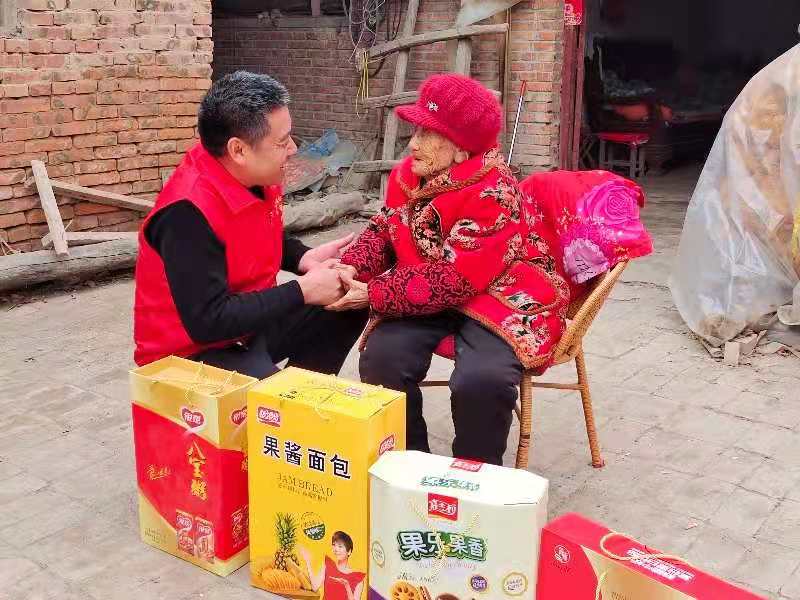 按照中國(guó)民間傳統(tǒng)習(xí)俗,新春伊始,人們都要穿戴新衣新帽走親訪友,拜年送祝福。2月12日,農(nóng)歷正月初一一大早,遜母口鎮(zhèn)心連心雷鋒服務(wù)隊(duì)隊(duì)長(zhǎng)張新靜帶領(lǐng)志愿者張建設(shè)、劉賀敬、馮茹愿、賈衛(wèi)蒙、馮柯馨、歐樣等人就敲開(kāi)了106歲的張占花家門(mén)。當(dāng)日,他們帶著核桃牛奶、面包、八寶粥,專門(mén)來(lái)為老人來(lái)拜年。 “新靜他們來(lái)了……”一聽(tīng)聲音,張占花老人就猜到了是誰(shuí)。經(jīng)過(guò)去年一年的幫扶,張新靜等人已經(jīng)與照顧占花老人成了“熟人”?!斑@些孩子們可沒(méi)少幫俺,又送物又幫俺打掃庭院”??吹街驹刚邆兊牡絹?lái),張占花老人的臉上掛滿笑容。