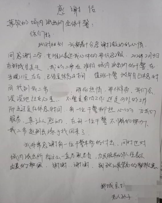 家屬告訴民警,老人去年剛做完手術(shù),身體存在一點(diǎn)問(wèn)題。民警告知老人家屬今后要看管好老人,謹(jǐn)防走失,并為老人建立易走失人員檔案,以備兄弟單位使用,老人家屬對(duì)城內(nèi)派出所表示感謝并寫了一封感謝信。