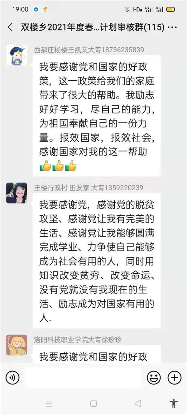 “感謝幫助過我家的所有幫扶人,沒有你們,就沒有我家今天的幸福生活,我們光榮脫貧了,作為貧困家庭中新成長(zhǎng)勞動(dòng)力,我一定珍惜這次來之不易的學(xué)習(xí)機(jī)會(huì),好好學(xué)習(xí)技術(shù),畢業(yè)后回村成為一名技術(shù)帶頭人,來促進(jìn)家鄉(xiāng)產(chǎn)業(yè)的發(fā)展?!编惓强h雙樓鄉(xiāng)孫莊村脫貧學(xué)生張素華在微信群里說。近幾天,鄲城縣雙樓鄉(xiāng)114人的大學(xué)生微信群里可熱鬧了,在鄉(xiāng)黨委政府的引導(dǎo)下,該鄉(xiāng)眾多脫貧后的大學(xué)生通過鄉(xiāng)里建起的微信群,紛紛圍繞“話脫貧、感黨恩、奮進(jìn)新時(shí)代”這一主題交流思想,提振斗志。