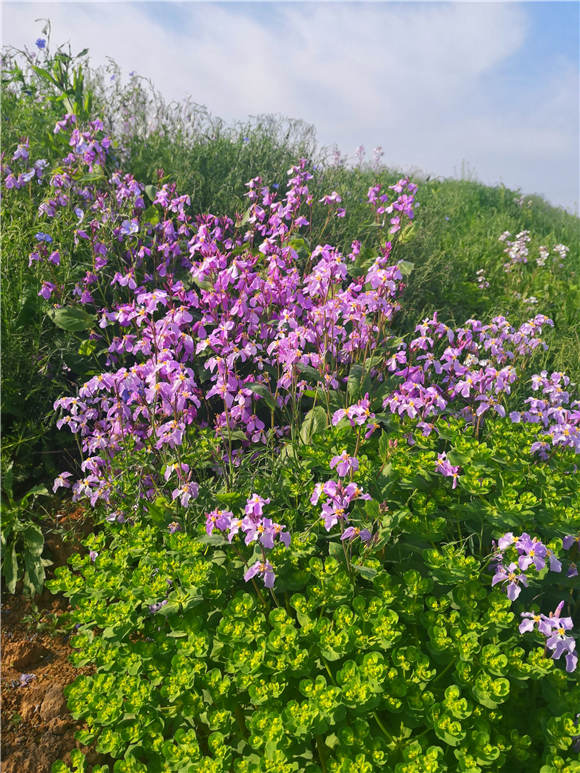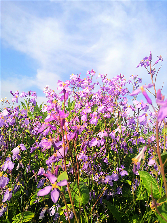 據(jù)了解,諸葛菜也叫二月蘭,因早春農(nóng)歷二月前后開花,所以叫二月蘭,花開溫柔,娟秀,清雅,很是招人喜歡。而且具有較強的耐寒性與適應(yīng)性,自繁能力比較強,一次播種能年年自成群落,能夠有效控制裸地揚塵起沙、抑制雜草生長。諸葛菜花花期相當(dāng)長,能夠從早春時節(jié),一直開到暮春初夏間,當(dāng)百花盛開時,它依然露著笑臉。因此著實是春天里的“早到遲退”之花。③5