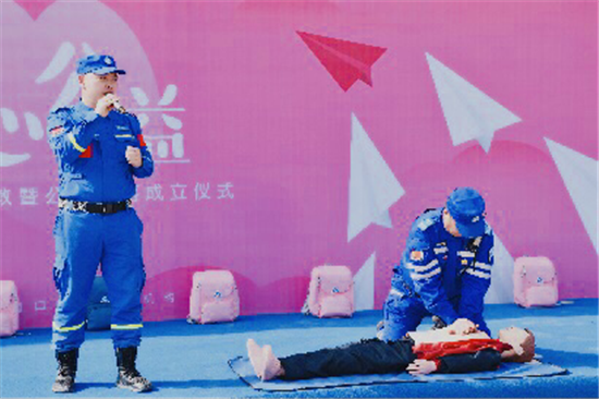活動(dòng)現(xiàn)場,藍(lán)天救援隊(duì)隊(duì)長孟坤以多年救援經(jīng)驗(yàn),與隊(duì)員們互相配合,演示如何正確穿戴救生衣、如何正確實(shí)施心肺復(fù)蘇術(shù)等,還生動(dòng)演繹了當(dāng)學(xué)生遇到有人落水等突發(fā)情況,如何在保證自己不受傷害的情況下實(shí)施救援。