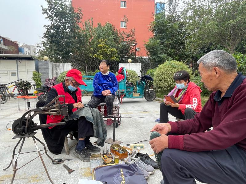 志愿者為老人縫補(bǔ)鞋子