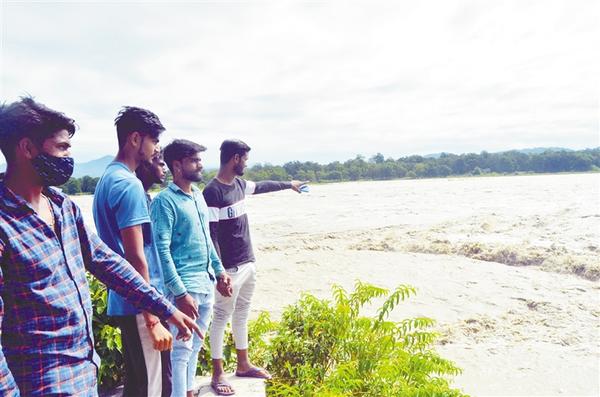 10月19日,人們在印度北阿肯德邦的赫里德瓦爾看著水位上漲的恒河。