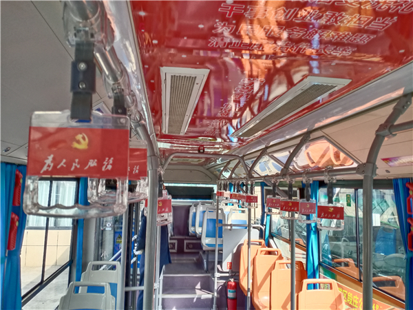 圖片說明:10月25日,記者在周口市公交總公司院內看到,一輛車頭前印有“紅色主題班線”標識的公交車格外引人注目,雖然該車的外形與其他車差別不大,可是車廂內貼滿了紅色標語口號,給人耳目一新的感覺。記者看到,車廂內的扶手、座椅及車頂上都貼有“為人民服務”“學黨史、悟思想、辦實事、開新局”“革命小故事”等宣傳內容。③2