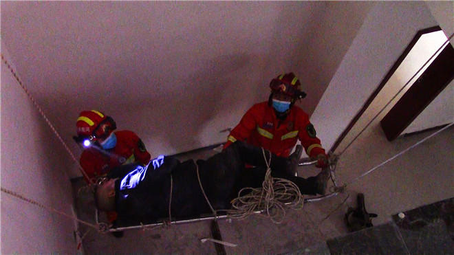 了解情況后,4名消防員立即深入地下室,利用擔(dān)架,先將老人保持原有姿勢(shì)轉(zhuǎn)移到擔(dān)架上,再用救援繩將老人綁在擔(dān)架上加以固定。最后,救援人員將擔(dān)架四角分別綁上救援繩,下方人員托扶擔(dān)架,上方人員將擔(dān)架平穩(wěn)的向上拉。經(jīng)過(guò)近30分鐘緊張救援,成功將被困老人救出,并交由醫(yī)護(hù)人員進(jìn)行下一步處理。②10