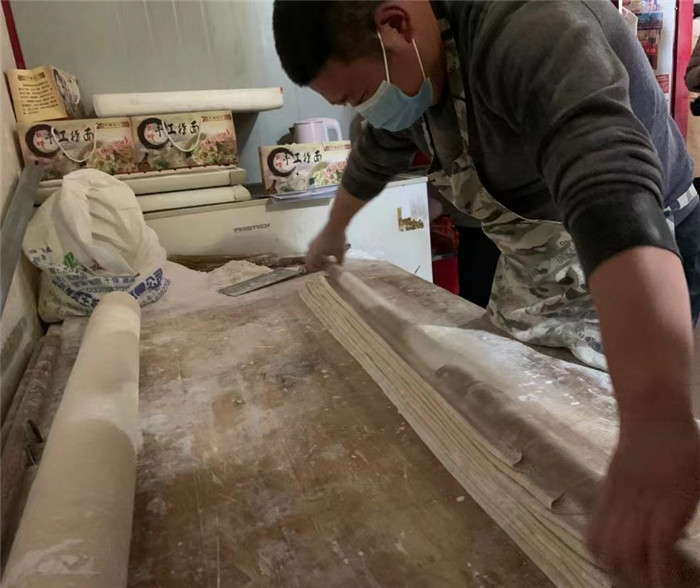 此時,固墻鎮(zhèn)集市最低溫度為零攝氏度,40歲的王永強(qiáng)卻汗流浹背。他,正在自家面館里忙得熱火朝天。從14歲起,王永強(qiáng)就跟著表哥學(xué)習(xí)做手搟面,到現(xiàn)在已有26年的制作經(jīng)驗?!斑^年這段時間一天搟10小時以上,能出個七八百碗,就這都賣不及?!蓖跤缽?qiáng)邊說邊做準(zhǔn)備工作,只見他將一盆醒好的、重40斤,用高筋面粉和鹽和好的面團(tuán)鋪在案板上,拿出一根一米五長的鐵棍將面團(tuán)按壓平整,再用有十幾年歷史的搟面杖,邊鋪撒玉米淀粉、邊用力搟。1個小時后,面團(tuán)被搟至薄皮狀,最后按層折疊鋪好,用快刀切成相等寬度,撣走多余面粉,挽成麻花狀。如此,遇水不散、出水不沾、溫潤光滑、筋而不膩的固墻手搟面就完成了。固墻手搟面最常見的做法是用大火多水煮沸后,撈起配以番茄雞蛋、蒜泥黃瓜,拌勻后享用。夾起一筷子面條,觀其形如玉帶臨風(fēng),察其色若飛雪粼粼,送入口中品其味,則似玉蘭入口,真是美哉!爽哉!
