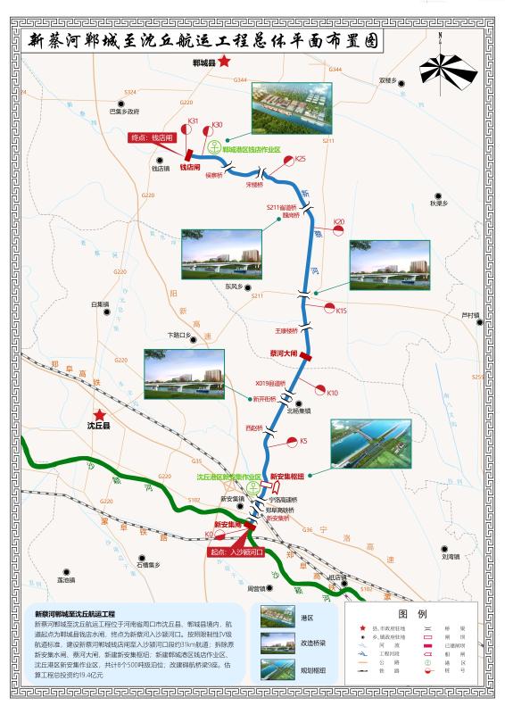 記者了解到,規(guī)劃中的鄲城港區(qū)是以新蔡河為依托,通過分析論證,確定其位置在新蔡河航運工程航道起點鄲城縣錢店鎮(zhèn),航道終點為沈丘縣新安集沙潁河口,航道里程31公里。航道通航標準為限制性Ⅳ級,設計船舶為500噸級。航道底寬40米,最小設計水深3.1米,最小彎曲半徑320米。船閘按照Ⅳ級船閘標準建設。沿線建設沈丘港區(qū)新安集、鄲城港區(qū)錢店兩個作業(yè)區(qū),設計500噸級泊位8個,改建礙航橋梁標準9座。初步估算,工程總投資19.4億元。