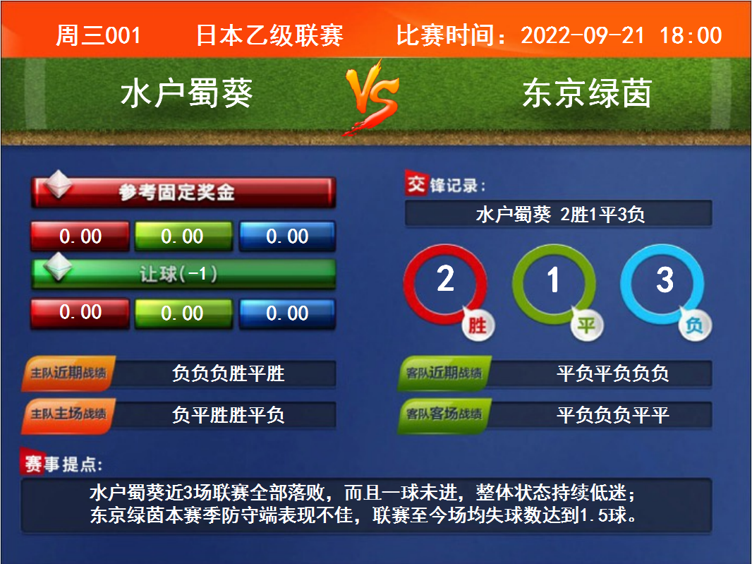比賽時間:2022-09-21 18:00賽事提點:水戶蜀葵近3場聯(lián)賽全部落敗,而且一球未進,整體狀態(tài)持續(xù)低迷;東京綠茵本賽季防守端表現(xiàn)不佳,聯(lián)賽至今場均失球數(shù)達到1.5球。