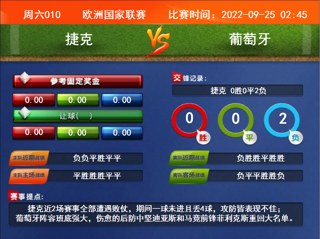比賽時間:2022-09-25 02:45賽事提點:捷克近2場賽事全部遭遇敗仗,期間一球未進且丟4球,攻防皆表現(xiàn)不佳;葡萄牙陣容班底強大,傷愈的后防中堅迪亞斯和馬競前鋒菲利克斯重回大名單。