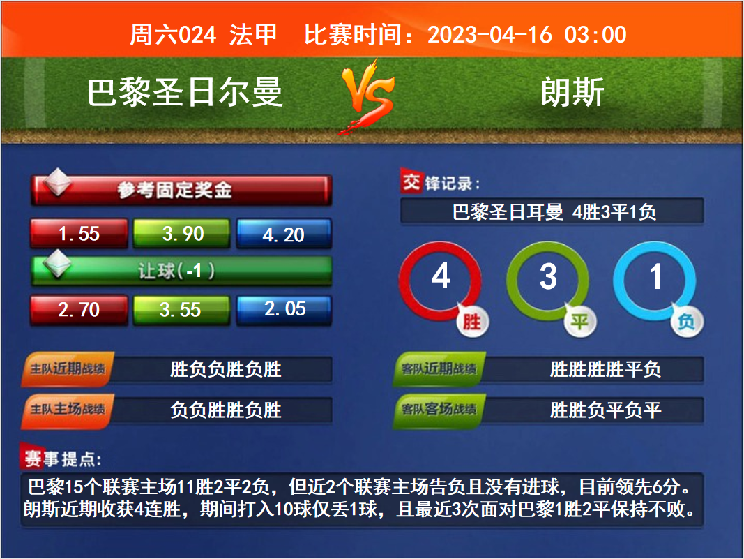 比賽時(shí)間:2023-04-16 03:00賽事提點(diǎn):巴黎15個(gè)聯(lián)賽主場(chǎng)11勝2平2負(fù),但近2個(gè)聯(lián)賽主場(chǎng)告負(fù)且沒有進(jìn)球,目前領(lǐng)先6分。朗斯近期收獲4連勝,期間打入10球僅丟1球,且最近3次面對(duì)巴黎1勝2平保持不敗。