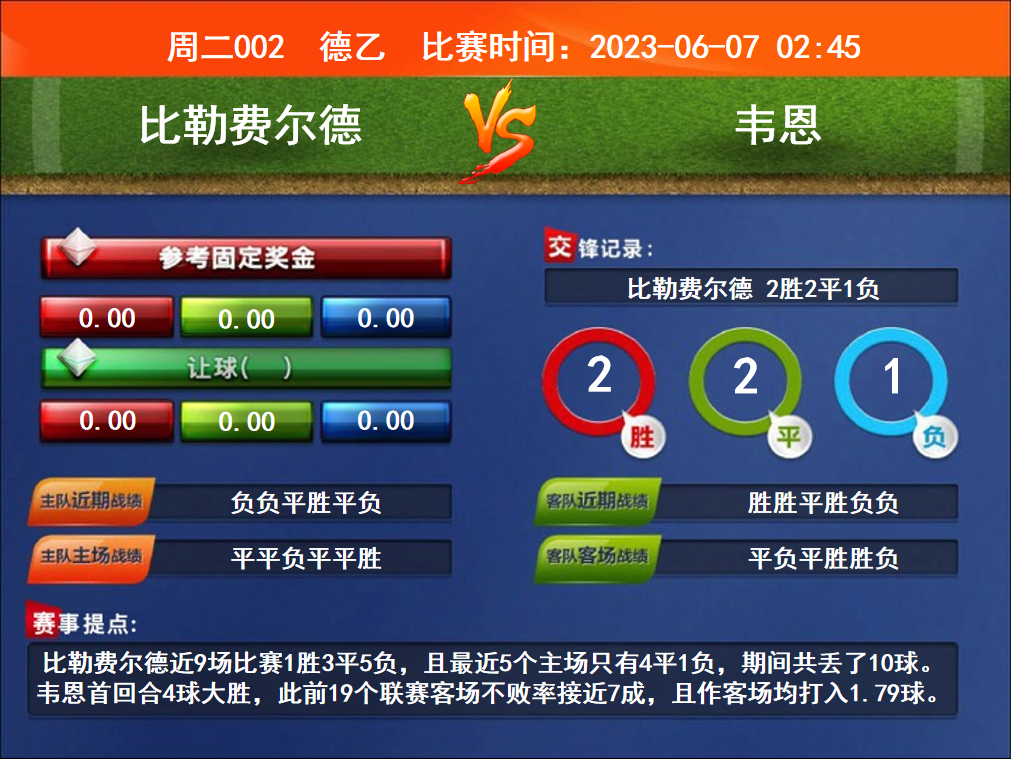 賽事提點:比勒費爾德近9場比賽1勝3平5負(fù),且最近5個主場只有4平1負(fù),期間共丟了10球。韋恩首回合4球大勝,此前19個聯(lián)賽客場不敗率接近7成,且作客場均打入1.79球。