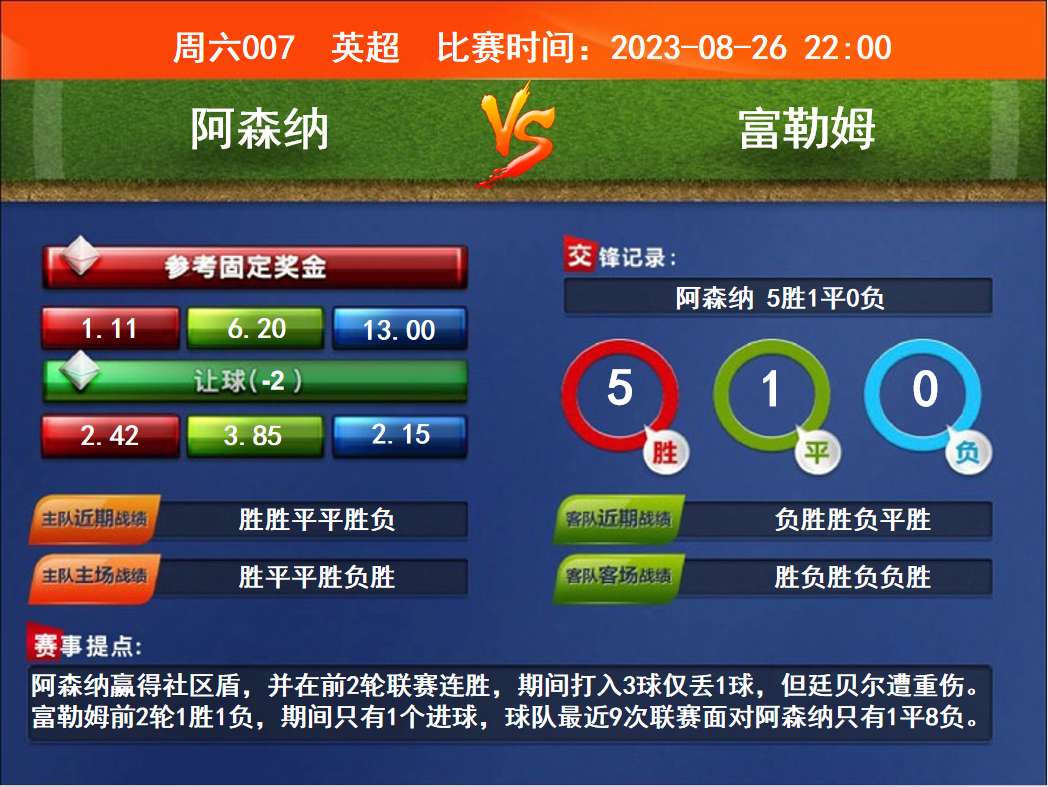 比賽時間:2023-08-26 22:00賽事提點:阿森納贏得社區(qū)盾,并在前2輪聯賽連勝,期間打入3球僅丟1球,但廷貝爾遭重傷。富勒姆前2輪1勝1負,期間只有1個進球,球隊最近9次聯賽面對阿森納只有1平8負。
