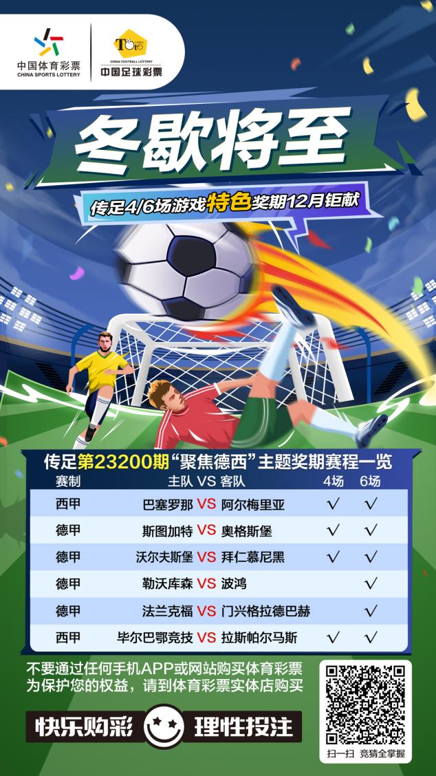 第23200期傳足特色獎(jiǎng)期已經(jīng)于12月17日20:00開售,將于12月20日22:00停售,并于12月21日開獎(jiǎng)。其中沃爾夫斯堡VS拜仁慕尼黑、斯圖加特VS奧格斯堡、巴塞羅那VS阿爾梅里亞和畢爾巴鄂競(jìng)技VS拉斯帕爾馬斯為4場(chǎng)進(jìn)球游戲競(jìng)猜賽事。