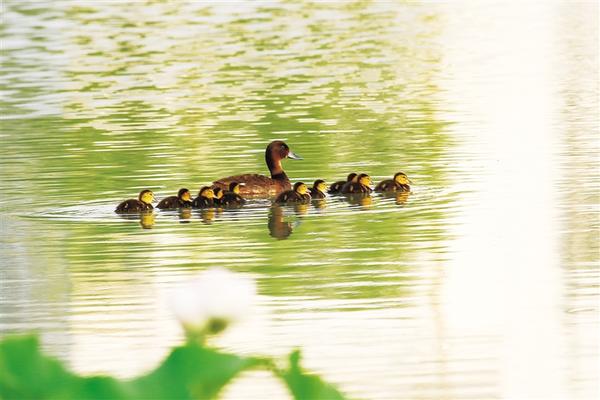 6月24日,世界極度瀕危物種、國家一級保護野生動物青頭潛鴨現(xiàn)身淮陽龍湖。當日,一只青頭潛鴨帶著10只可愛的“鴨寶寶”在湖中緩緩游弋。有關方面人士告訴記者,種種跡象可以證明:青頭潛鴨已在淮陽龍湖國家濕地公園安家落戶、繁衍生息。