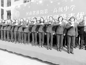 3月21日,淮陽一高舉行 “高考百日沖刺”誓師大會(huì)。校長王業(yè)生及高一、高二、高三年級(jí)全體師生參加了會(huì)議。青年教師代表付士翔、家長代表張鳳啟及學(xué)生代表分別進(jìn)行了充滿激情的發(fā)言。在距2015年高考還有100天的日子里,師生莊嚴(yán)宣誓:“以頑強(qiáng)的意志、百倍的激情、無窮的潛力,以最刻苦的精神、最堅(jiān)韌的毅力,全力以赴,奮勇爭(zhēng)先,爭(zhēng)分奪秒,苦戰(zhàn)百日,決戰(zhàn)高考,誓創(chuàng)輝煌?!?豆紀(jì)鋒 攝)