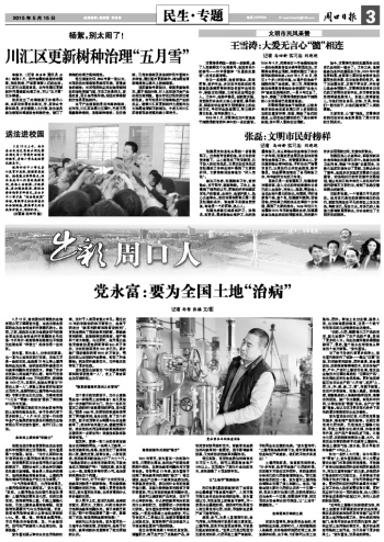 黨永富, 商水縣人,出身農(nóng)民家庭,也一直與土地和農(nóng)民打交道,但他又不是一般的農(nóng)民。他連續(xù)23年從事土壤污染和生態(tài)治理,他研發(fā)的肥料減量技術(shù)與除草劑副作用防控技術(shù),解除了許多農(nóng)民擔(dān)心田地減產(chǎn)的心病,每年可使我國(guó)在肥料減量1950萬(wàn)噸的同時(shí),新增糧食1000億斤。在國(guó)內(nèi),他被業(yè)界譽(yù)為”中國(guó)治土第一人”,曾登上聯(lián)合國(guó)講壇宣講此項(xiàng)技術(shù)。他撰寫(xiě)的《土壤污染與生態(tài)治理》專著日前也正式出版,為落實(shí)我國(guó)“十三五”“兩減一控規(guī)劃”提供了理論教材與技術(shù)支撐。