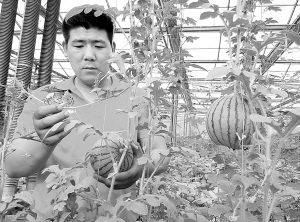 扶溝縣豫星農(nóng)業(yè)發(fā)展有限公司種植的“迷你彩虹西瓜”,以個小、皮薄、甜度高暢銷省內(nèi)外,畝均收入達(dá)3萬元。圖為員工正在為“彩虹西瓜”整枝打杈。(谷志方 攝)