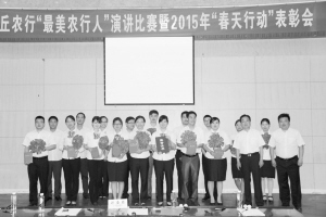 6月6日,沈丘農(nóng)行召開“最美農(nóng)行人”演講比賽暨2015年“春天行動”表彰大會。圖為獲獎人員合影留念。(陳高翔 攝)
